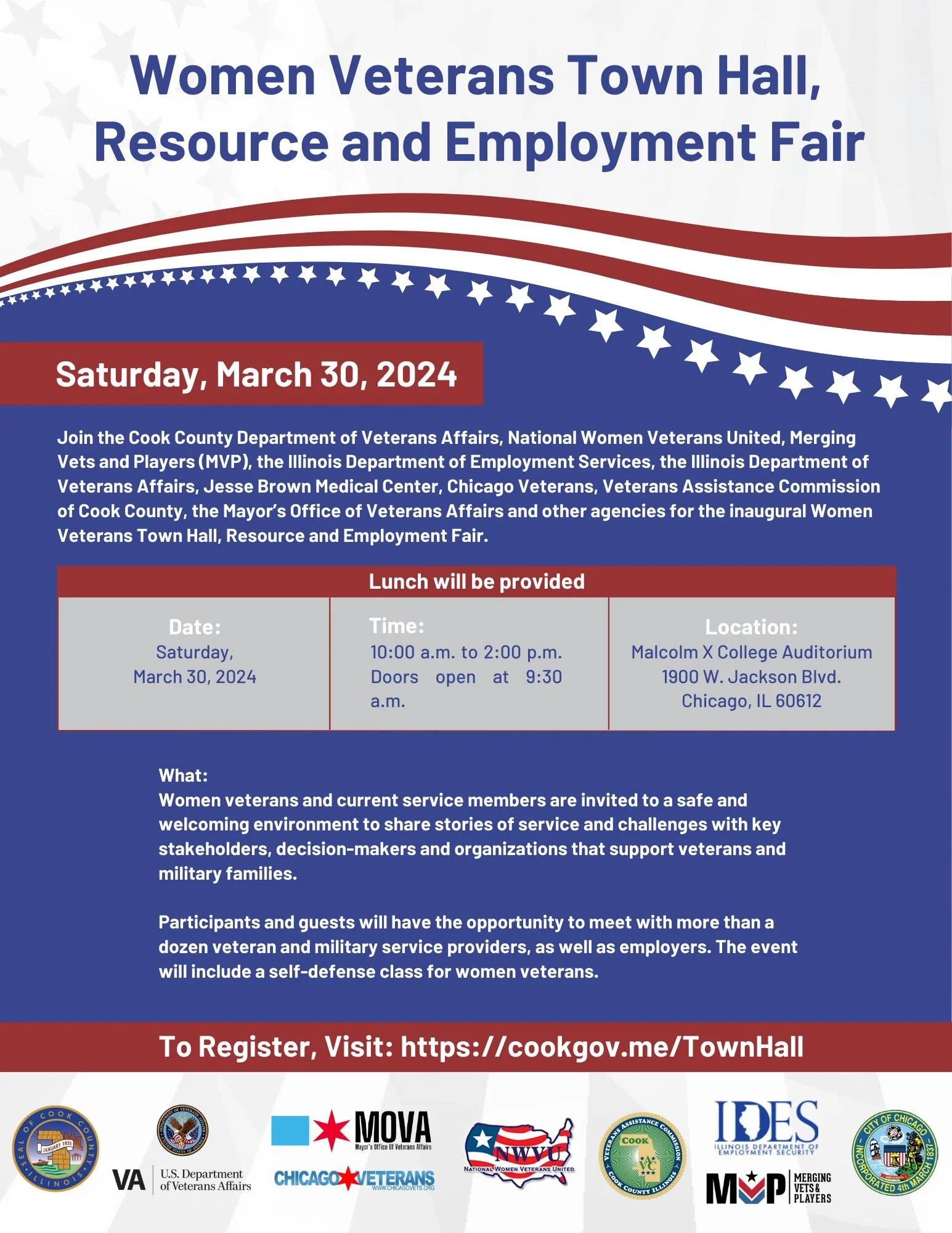 Back to All Events Women Veterans Town Hall, Resource and Employment Fair Saturday, March 30, 2024 10:00 AM 2:00 PM Malcom X College, Auditorium 1900 West Jackson Boulevard Chicago, IL, 60612 United States (map) Google Calendar ICS
